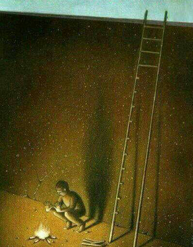 第二題,漫畫題:一個人在井里烤火,烤火的木柴是井里的梯子,起標題,并談看法。