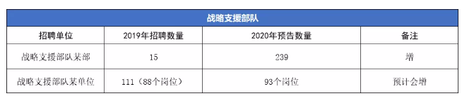 戰(zhàn)略支援部隊是一個大的系統(tǒng),根據(jù)已經(jīng)發(fā)布的機構(gòu)崗位數(shù)量來看,新增的招考數(shù)量和崗位數(shù)量都有明顯的變化,預計戰(zhàn)略支援部隊招錄文職人員會更多。